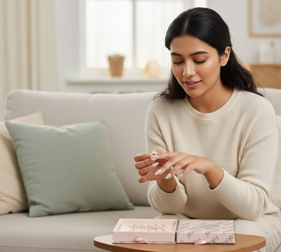 The Febble Nude Shine Leaf Press-On Nails offer a soft, elegant nude tone with silver leaf detailing and glossy shine accents. Designed for effortless beauty, these premium nails provide a salon-quality manicure in minutes without any professional tools.